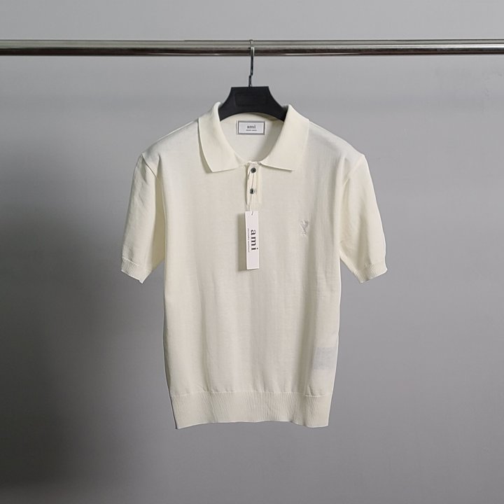 / [국내배송]아미 화이트 하트자수 린넨 반팔 카라 니트
